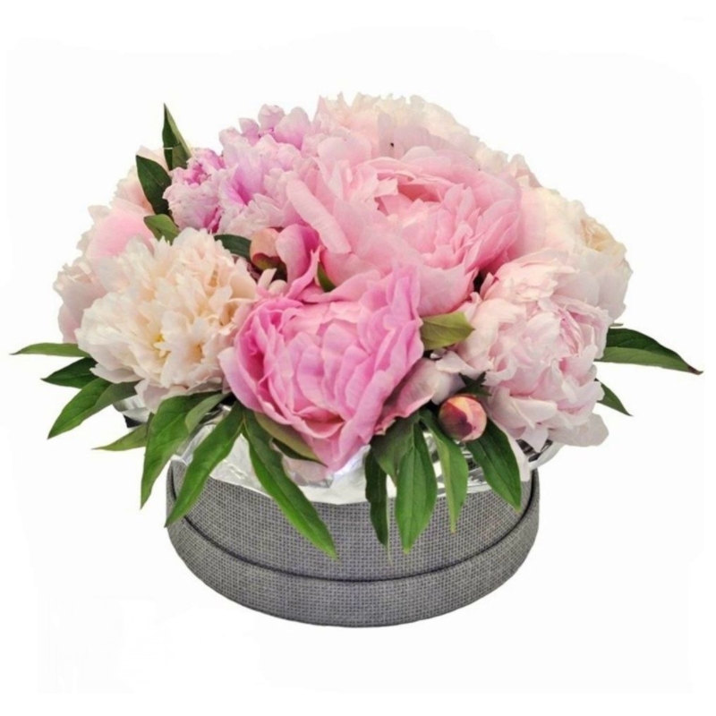 Букет состоит из 11 разноцветных пионов, зелень, коробка, оазис.