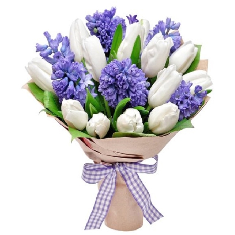 Букет состоит из 7 гиацинтов, 16 белых тюльпанов, крафт, лента.