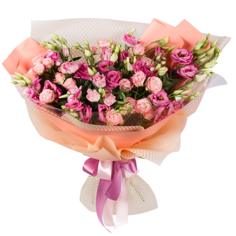 Букет состоит из 5 кустовых роз, 6 веток эустомы, зелень, красивая упаковка, атласная лента.